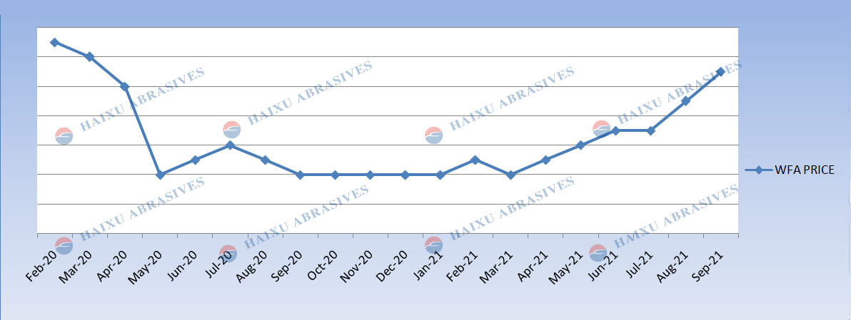 This week, the price of raw Al2O3 powder is getting down more and affecting WFA price. The cost of fused alumina blocks drops. As a result, the price of WFA section sand is lower than last week. On the other hand, many WFA plants in China have less intention to purchase WFA blocks. In the aspect of supply, there isn’t much capacity in the market as users expected. So the price of WFA grains is still relatively stable. In the coming week, the price of WFA grains will not fluctuate a lot. But still in the low range.
